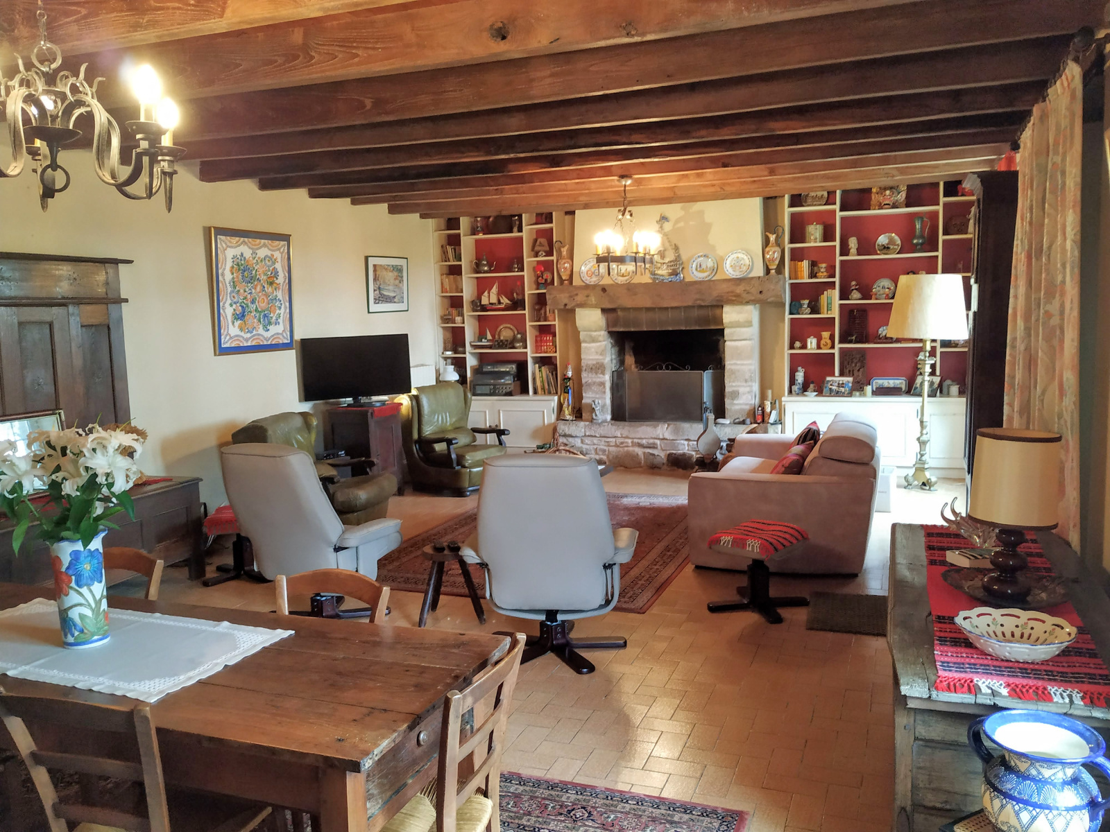 Le hall d'entrée donne accès à une cuisine d'environ 20m2 avec une grande cheminée (fonctionnelle) à foyer ouvert, un vaste séjour/salon d'environ 55m2 exposé plein sud et disposant également d'une belle et grande cheminée (fonctionnelle) à foyer ouvert; Une chambre d'environ 20m2 aves une salle de bains privative, un bureau d'environ 8m2 (pouvant faire office de dressing), une chaufferie.