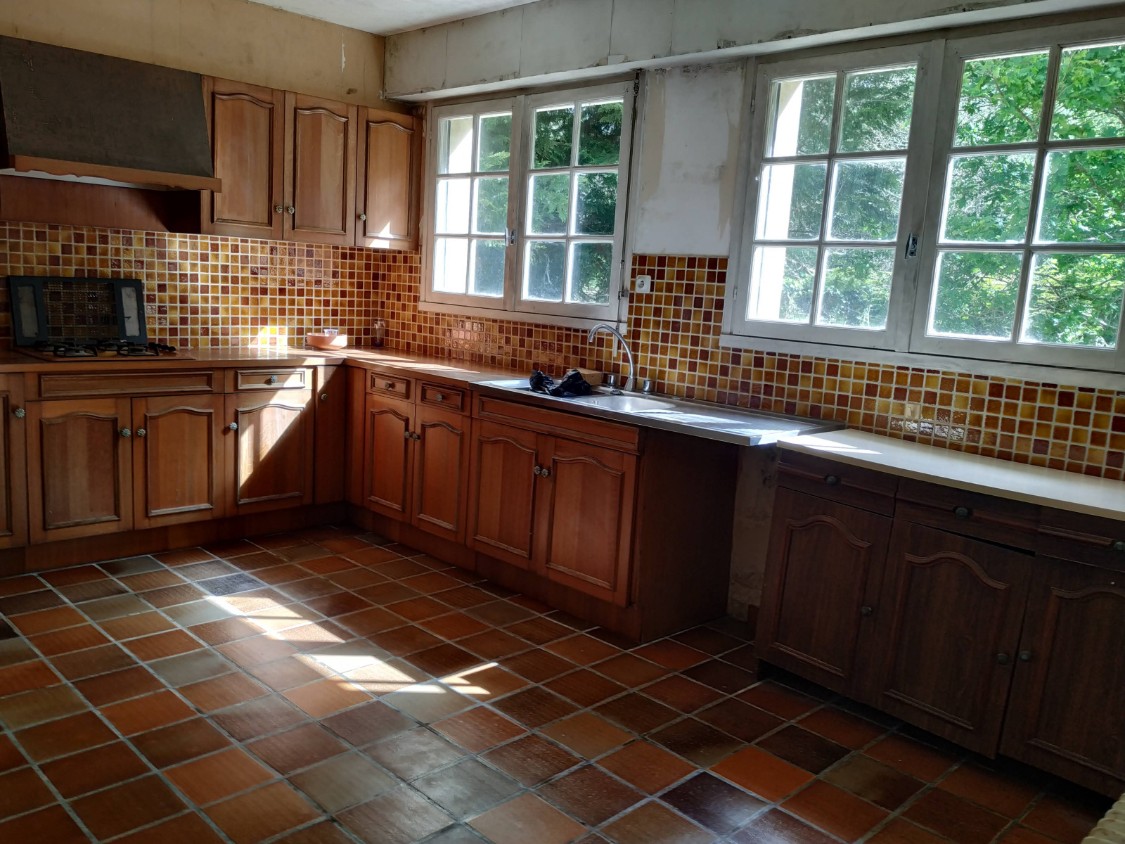 Cuisine aménagée et équipée en bois. Très lumineuse grâce aux nombreuses fenêtres (4) donnant sur le jardin arrière. N'a pas servie depuis 2001.