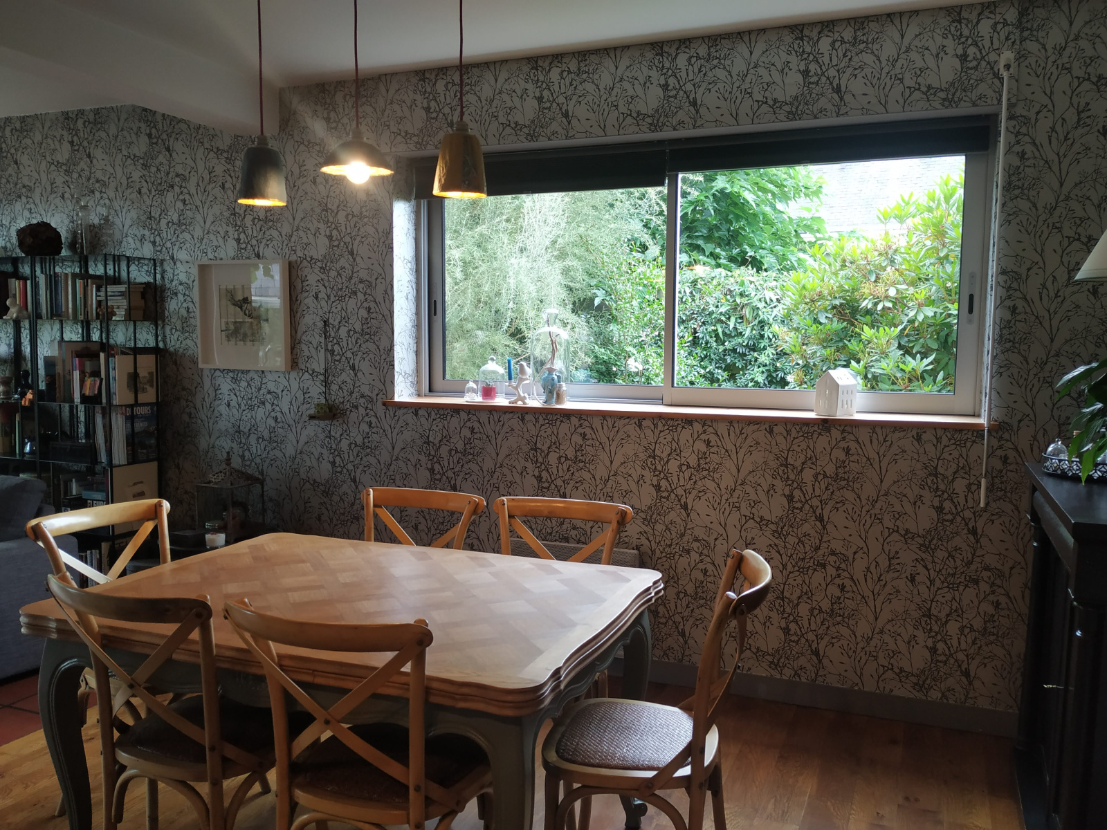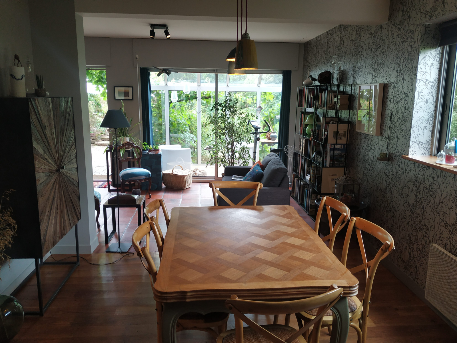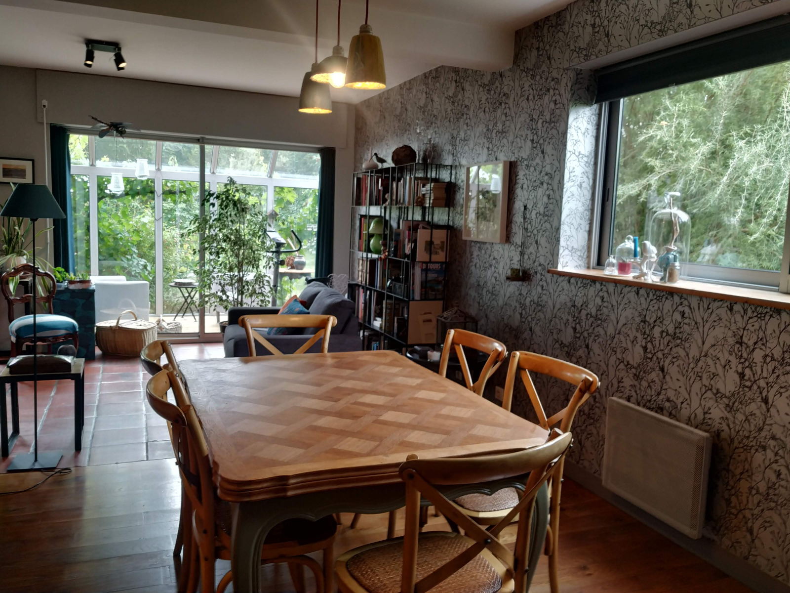 Il donne ensuite sur un vaste séjour/salon avec un poêle à bois et une salle à manger sur parquet bois au charme certain dont les ouvertures donnent sur le jardin verdoyant et bucolique.