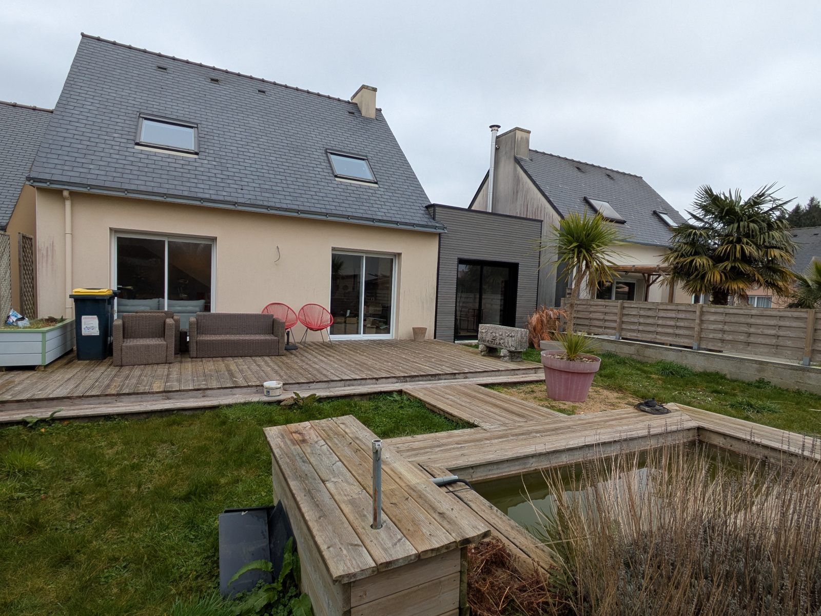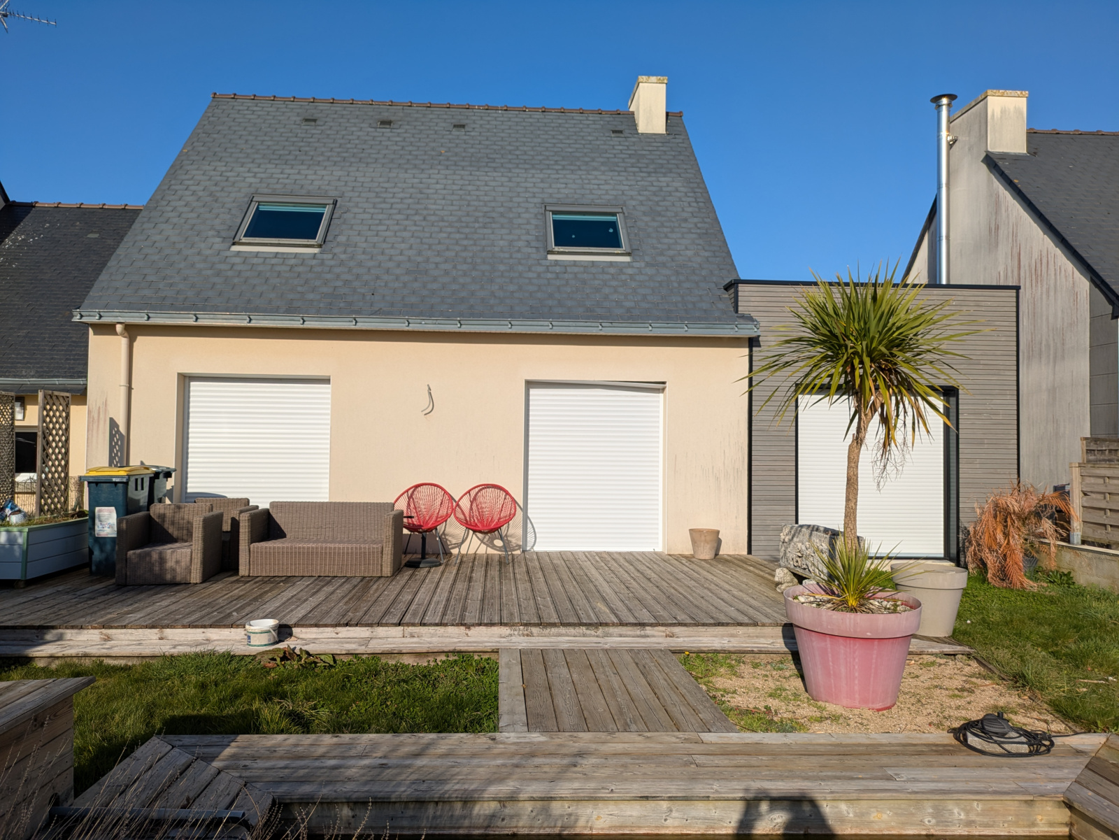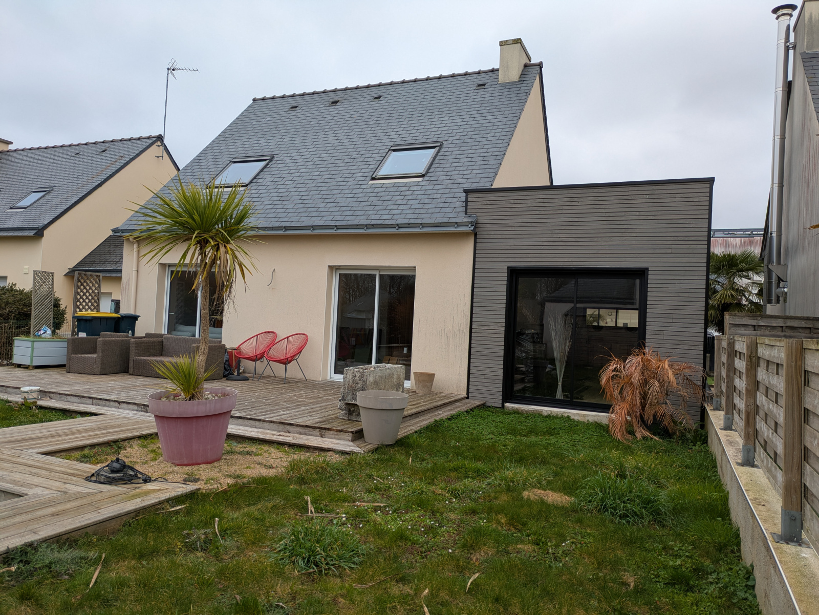 Au rez-de-chaussée, la pièce de vie lumineuse, exposée sud, avec cuisine ouverte, crée un espace convivial. Un espace pouvant faire office de chambre ou de bureau ainsi qu’un WC séparé complètent ce niveau. En 2024, une extension en bois de 26 m² a permis d’ajouter une belle chambre de plain-pied.