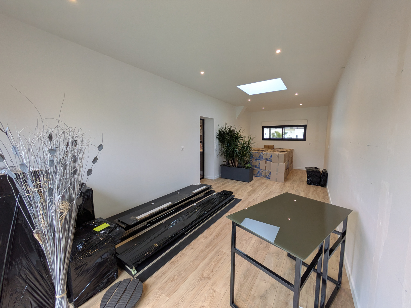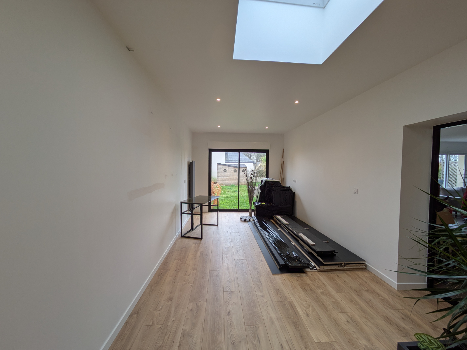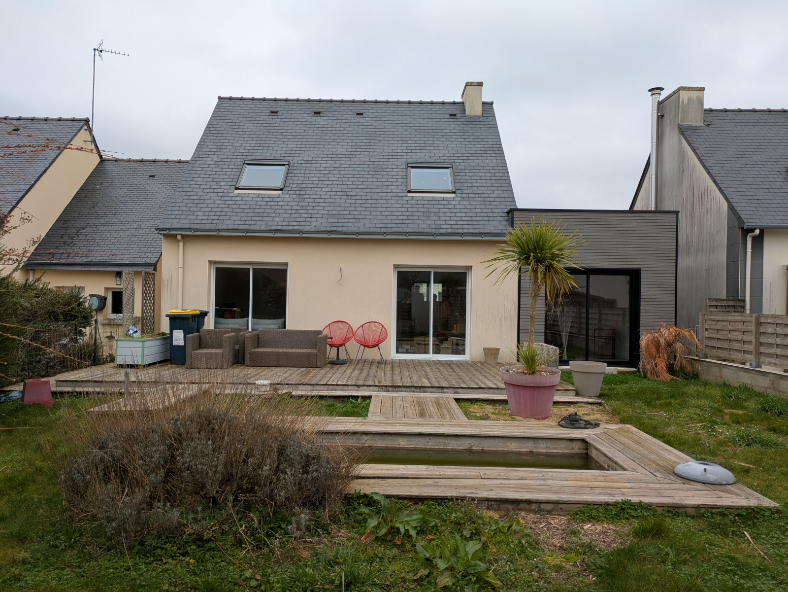 Au rez-de-chaussée, la pièce de vie lumineuse, exposée sud, avec cuisine ouverte, crée un espace convivial. Un espace pouvant faire office de chambre ou de bureau ainsi qu’un WC séparé complètent ce niveau. En 2024, une extension en bois de 26 m² a permis d’ajouter une belle chambre de plain-pied.