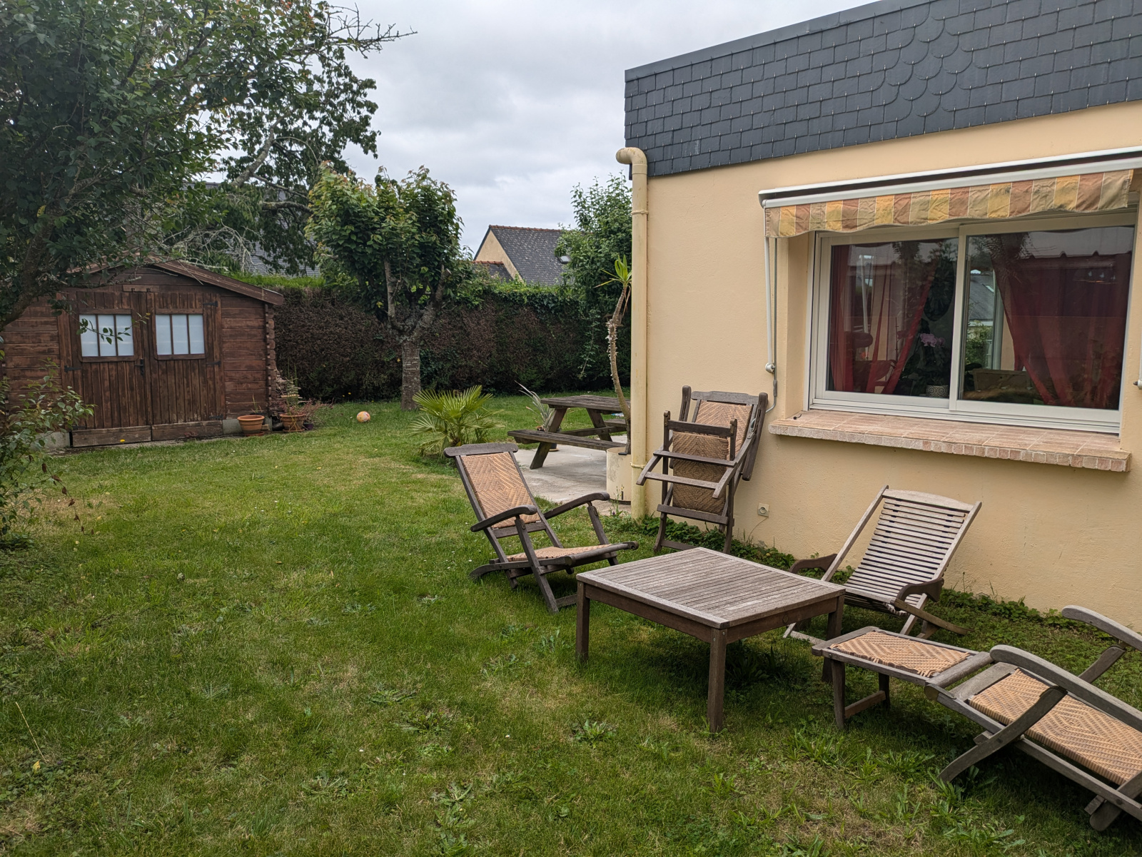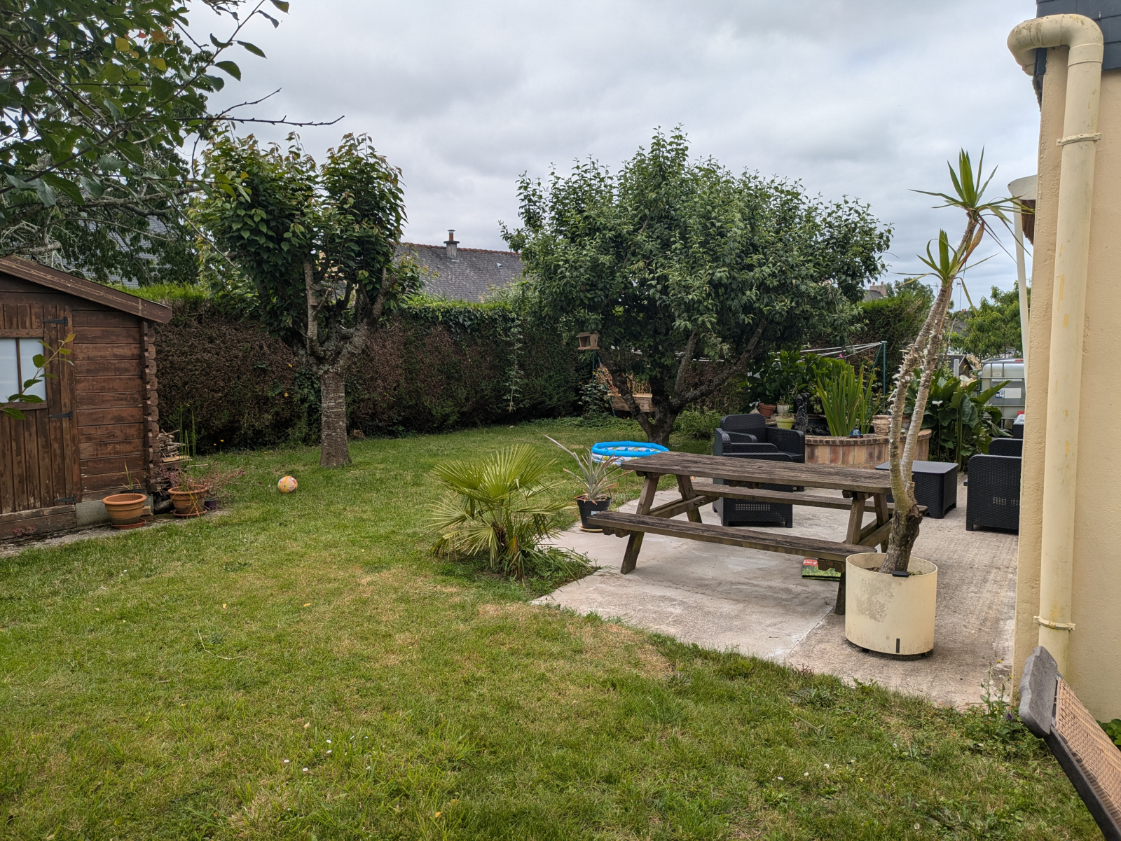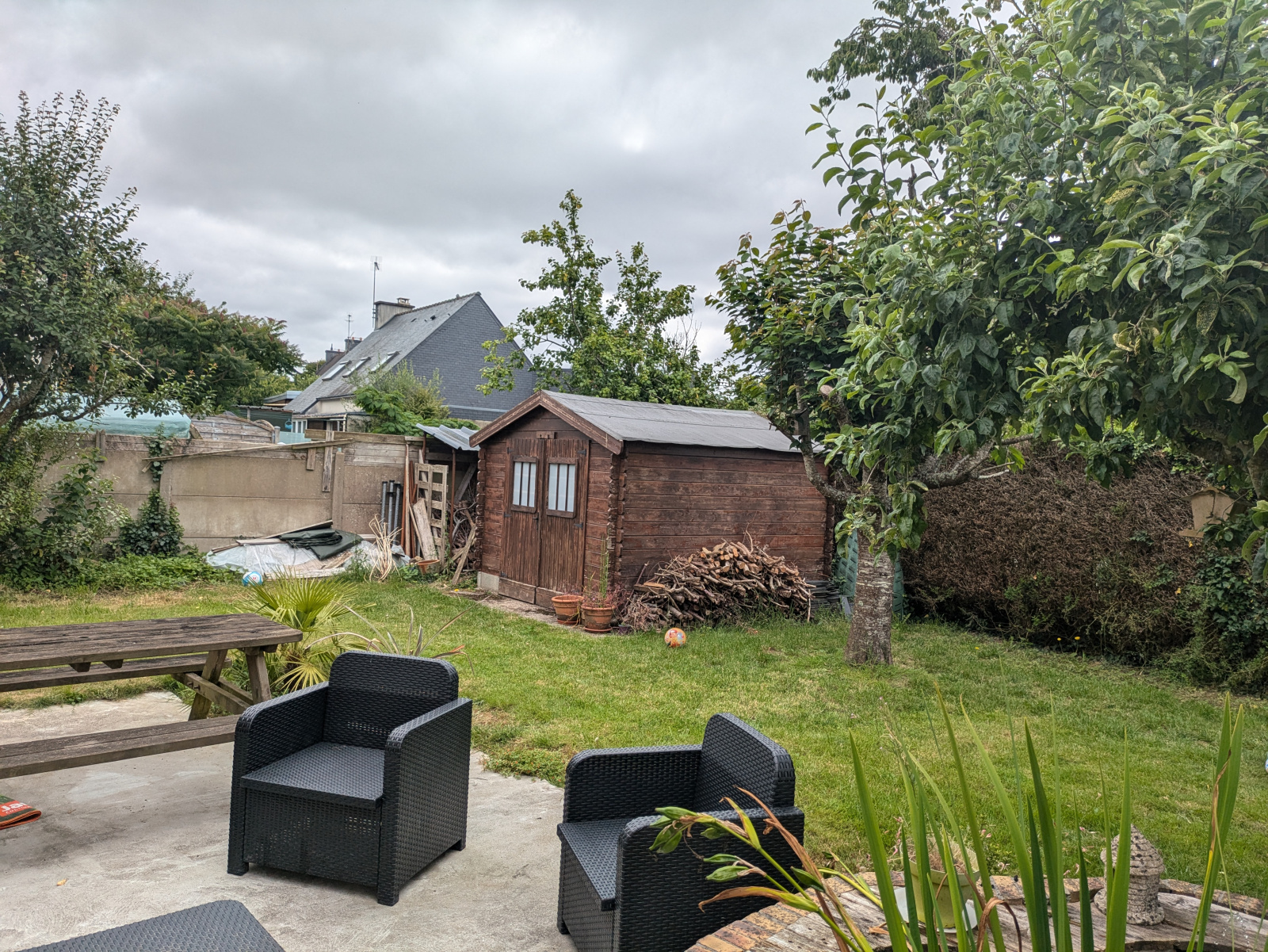 Le jardin de 603 m², avec son cabanon, offre un espace extérieur agréable.