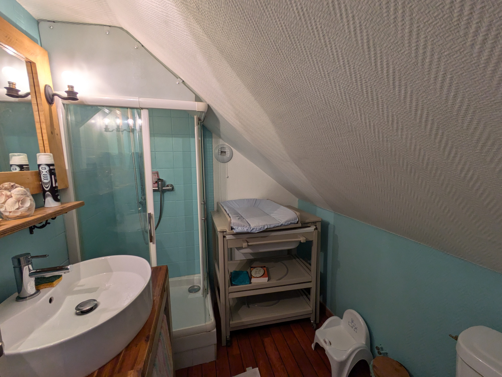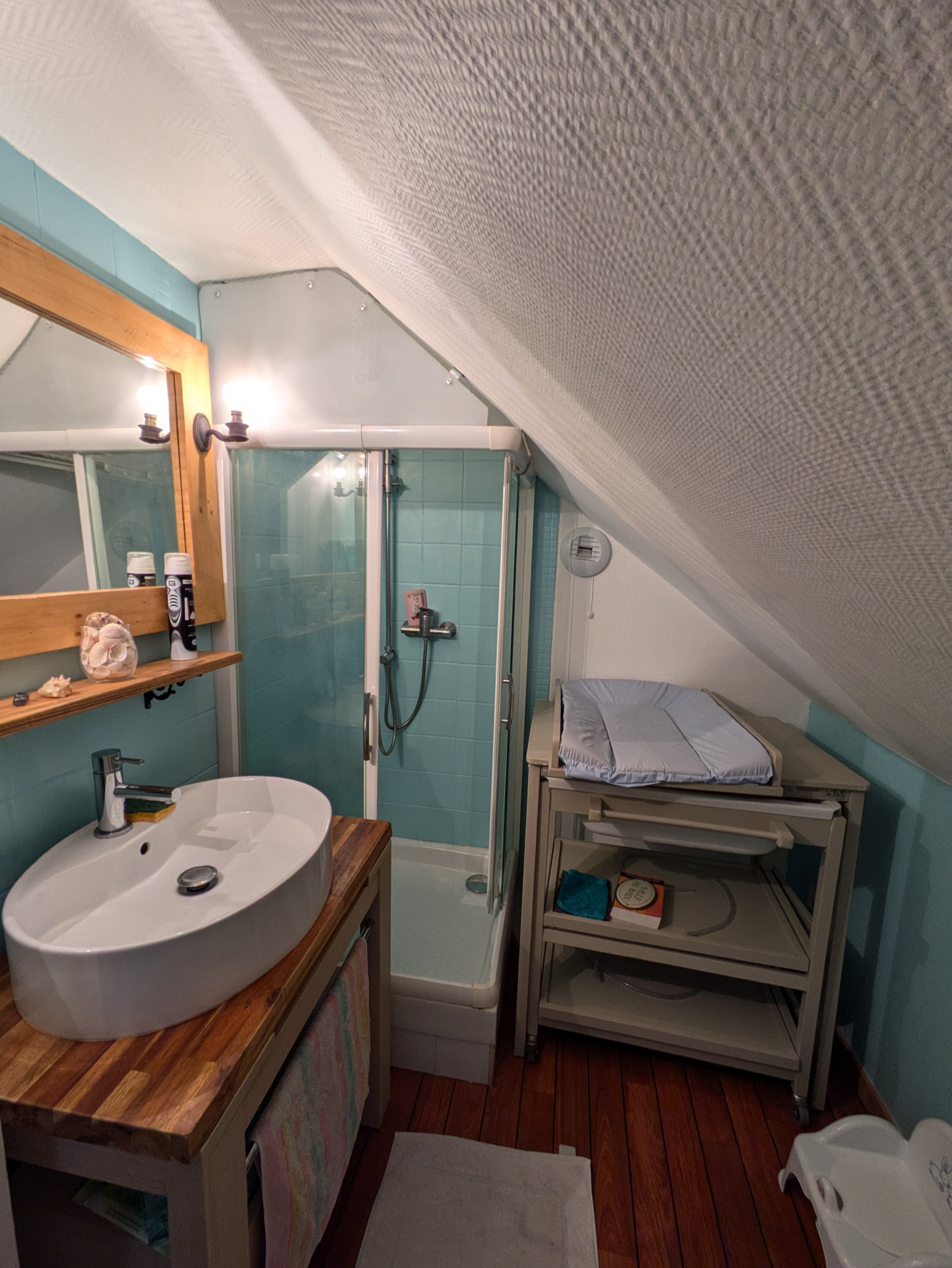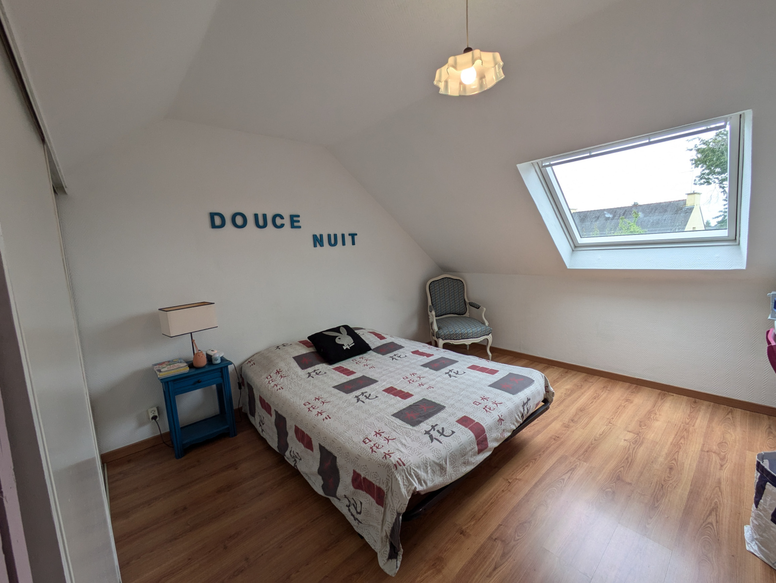 À l'étage, vous trouverez deux chambres supplémentaires, dont une avec dressing, ainsi qu'une petite salle d'eau avec WC, spécialement conçue pour les enfants.