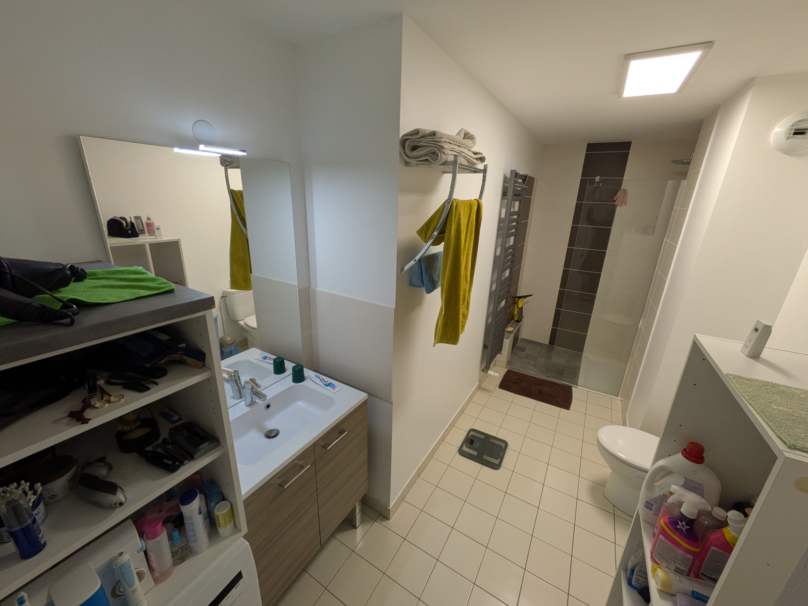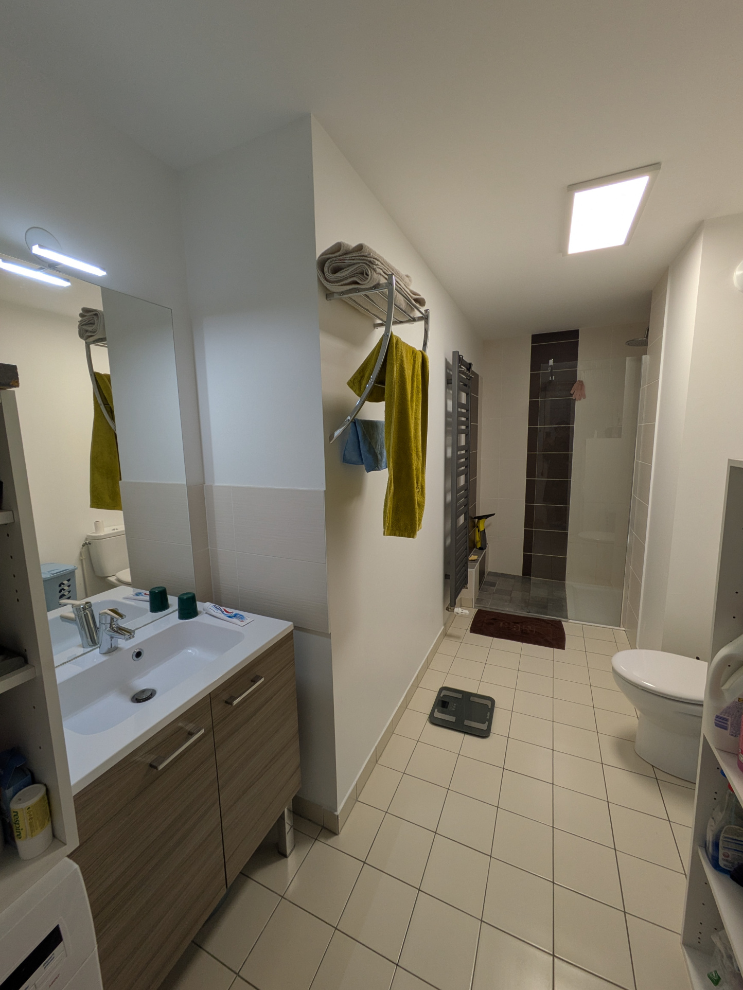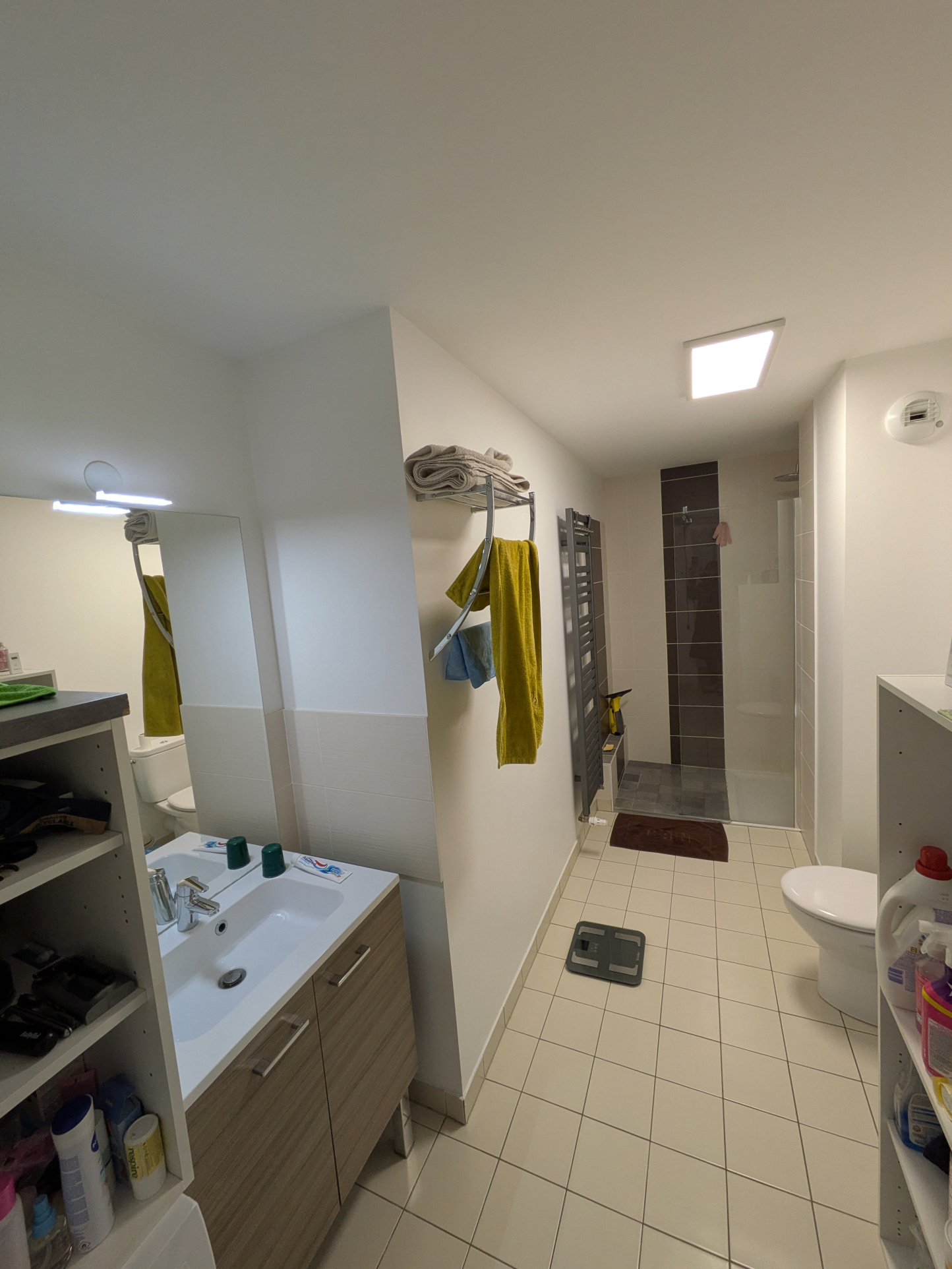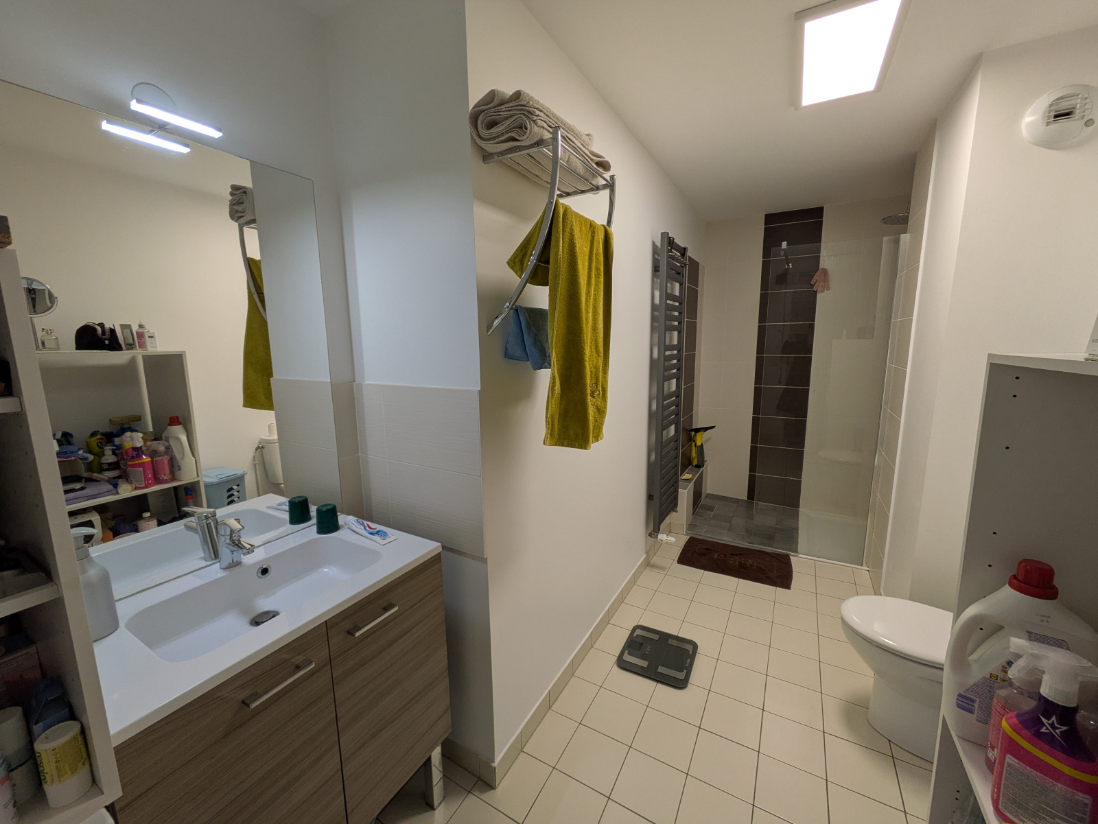 La salle d’eau, spacieuse et adaptée aux normes PMR, est bien agencée avec vasque, douche et WC.