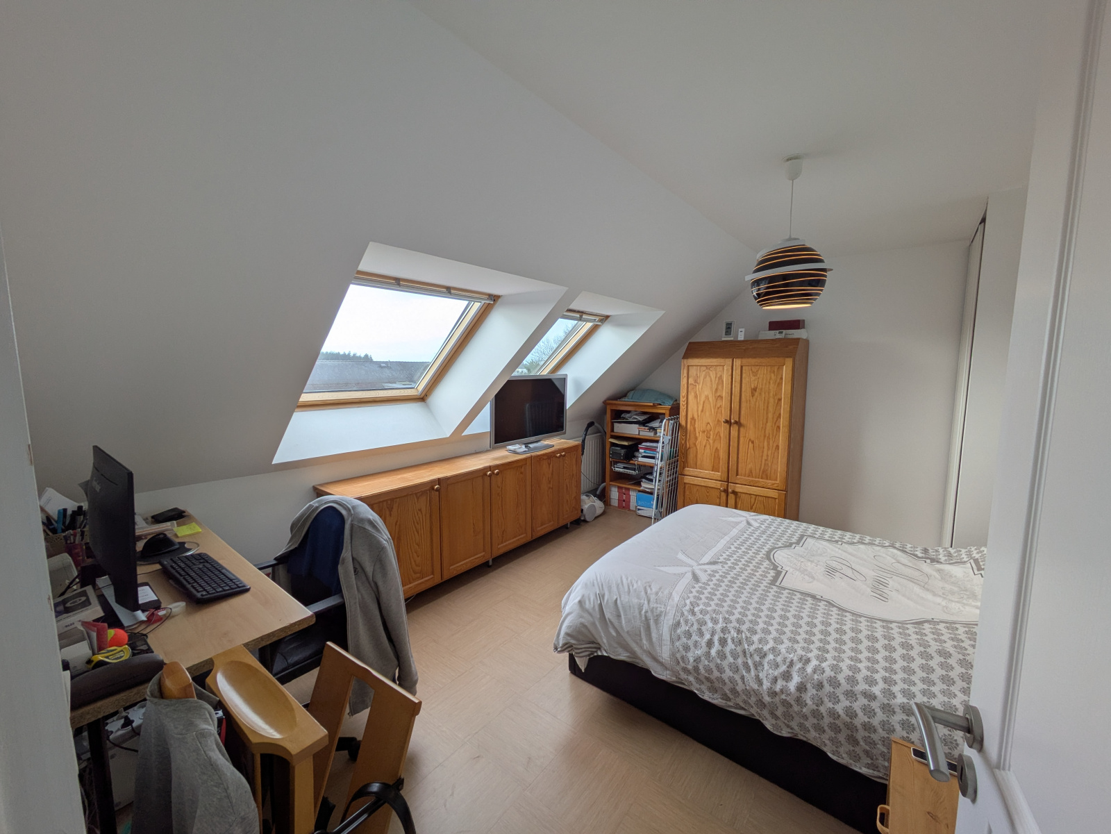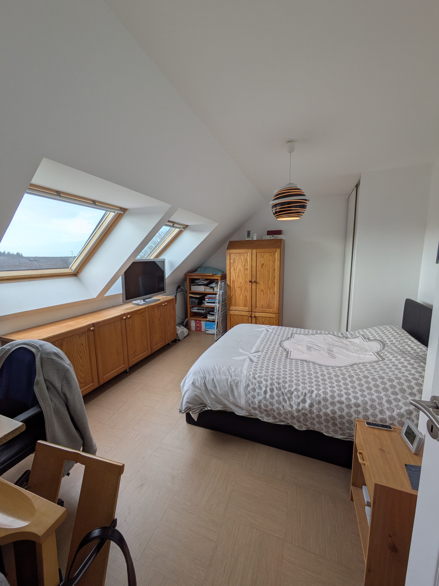 La chambre d'environ 15 m² bénéficie d’une fenêtre de toit apportant une belle lumière naturelle et comprend également un placard intégré.