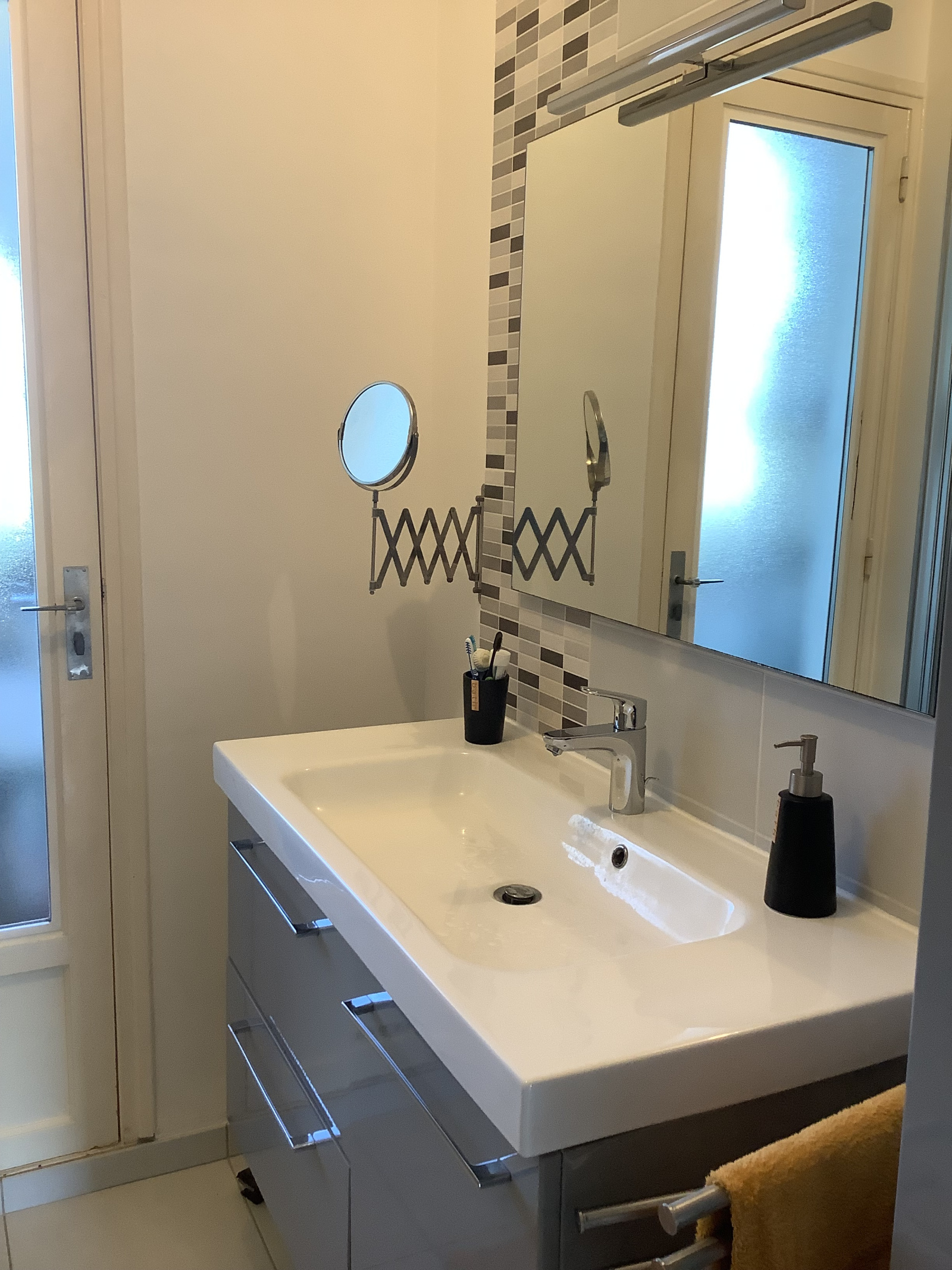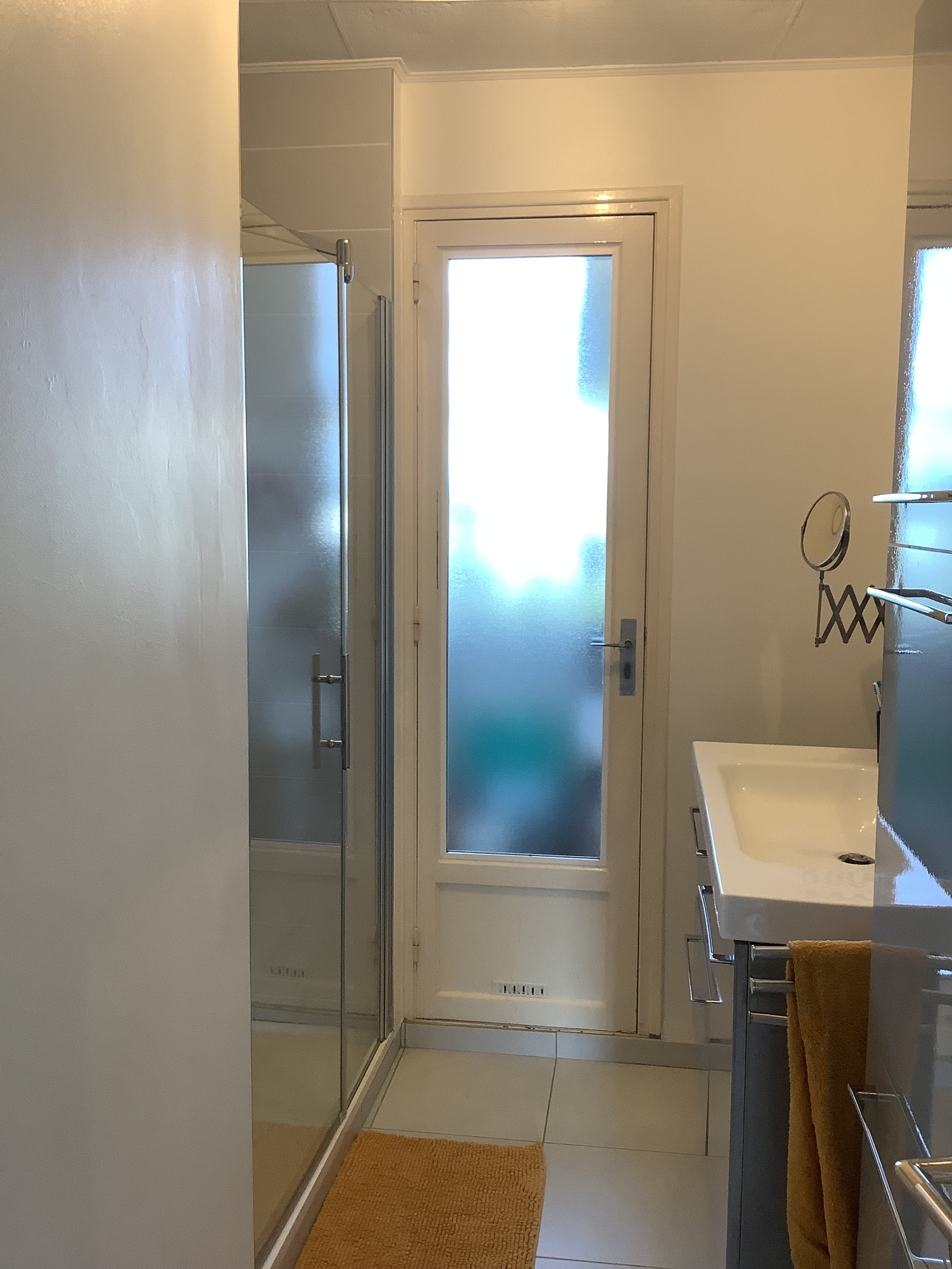 Un couloir avec placards dessert un WC séparé et une salle d'eau moderne avec une remise.
