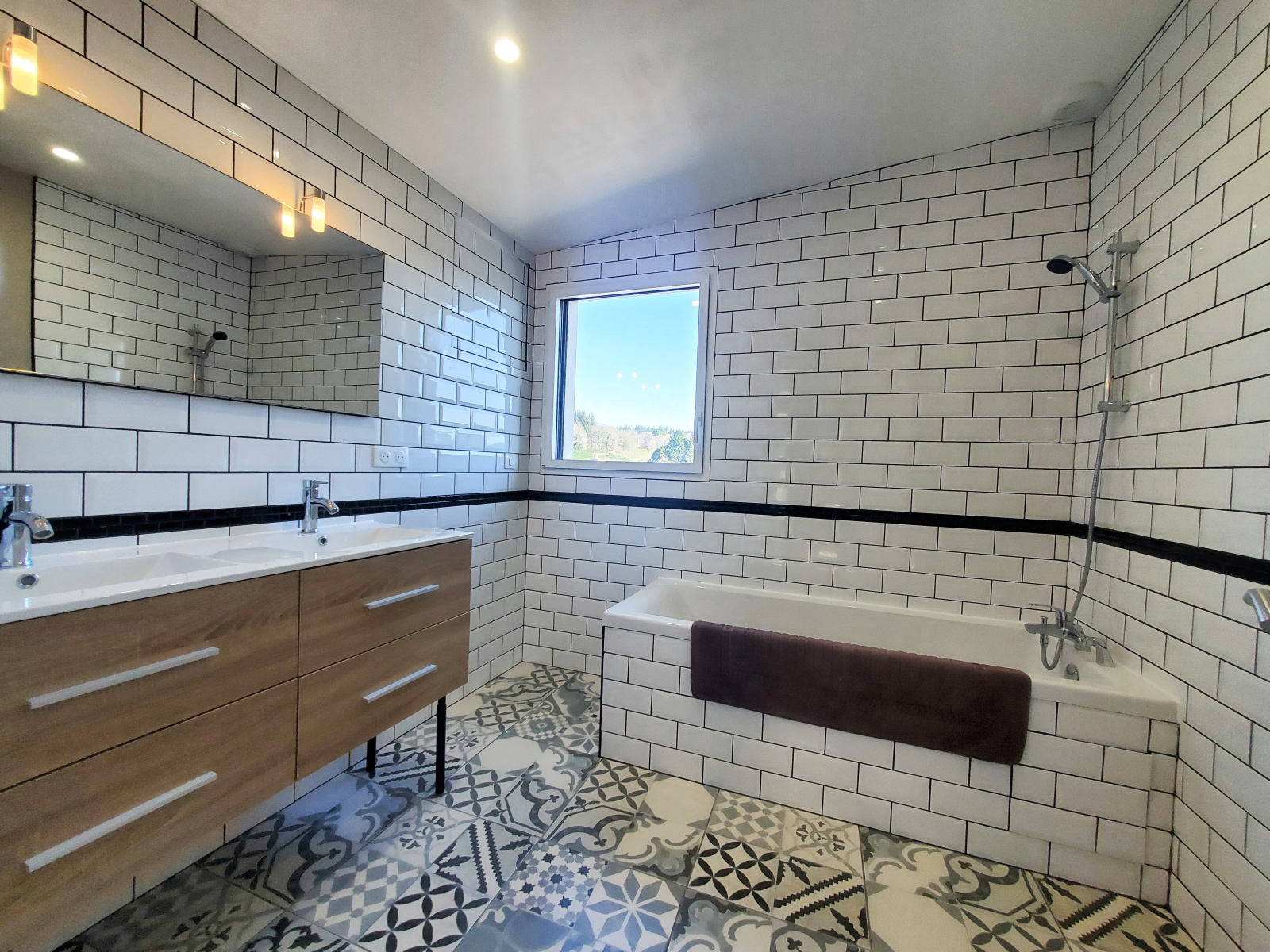 L'étage dispose d'un dégagement pouvant être aménagé en espace bureau, de deux chambres avec placards (une chambre donne sur un toit terrasse). Un WC indépendant et une salle de bains avec baignoire et une double vasque. Le garage de 20 m² avec porte motorisée est attenant à la maison.