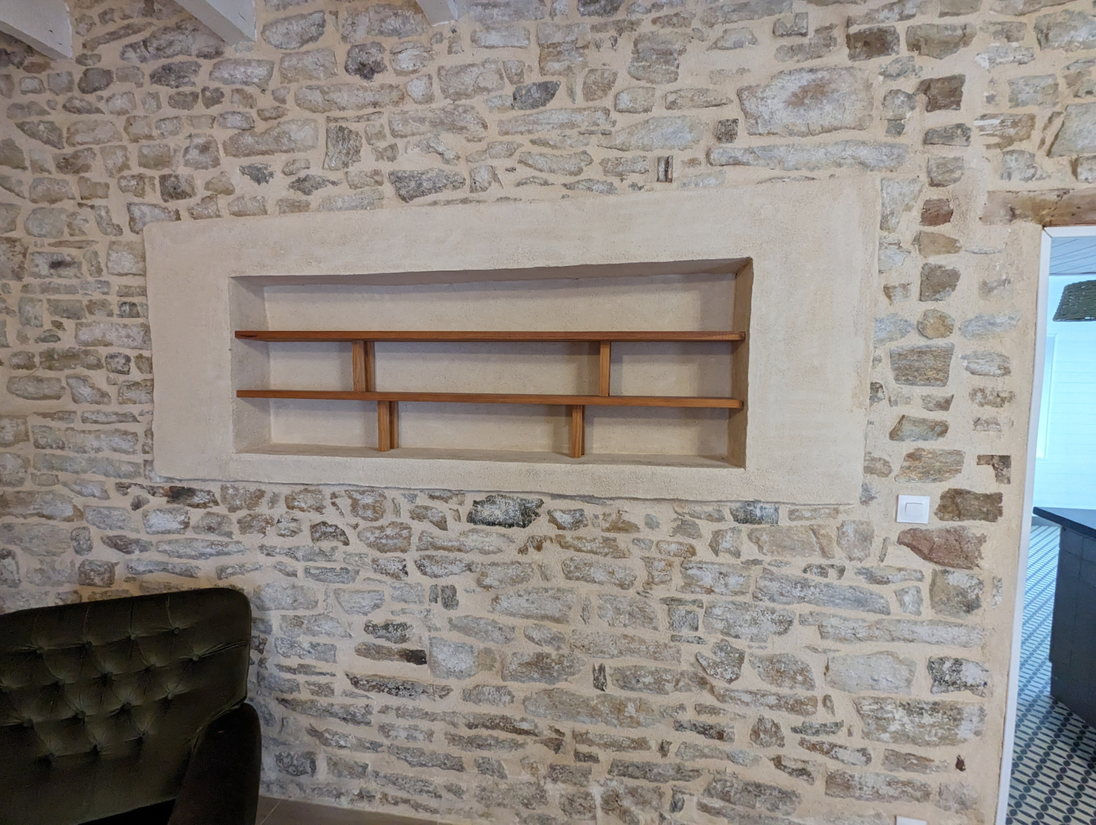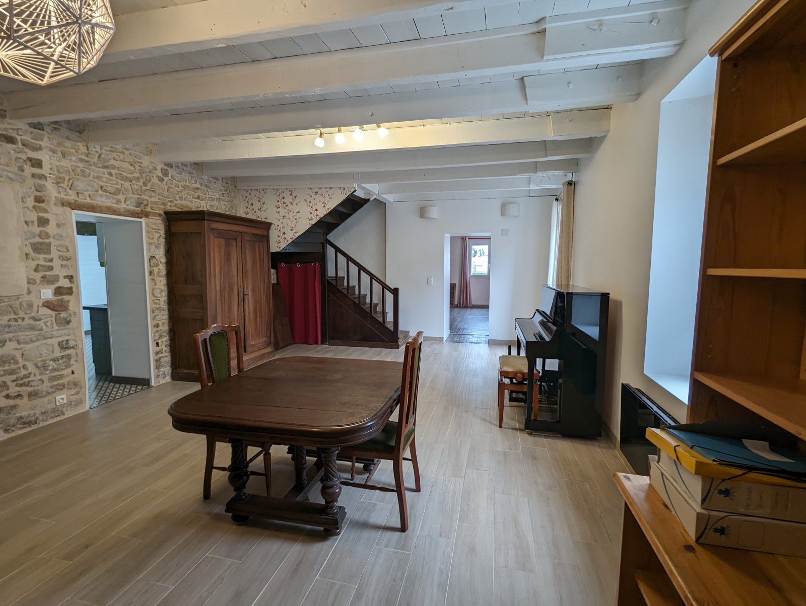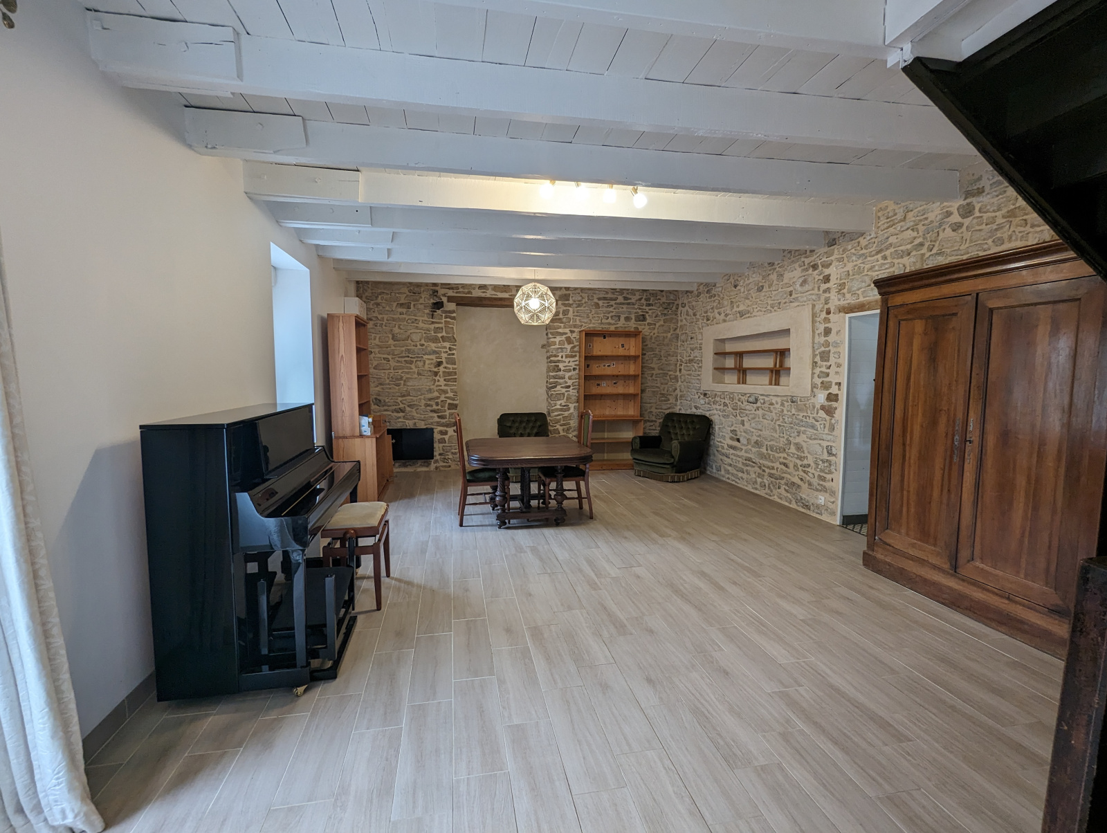Dès l'entrée, vous serez séduit par l'ambiance chaleureuse du séjour/salon, où le charme des poutres apparentes et des murs en pierres crée une atmosphère authentique.