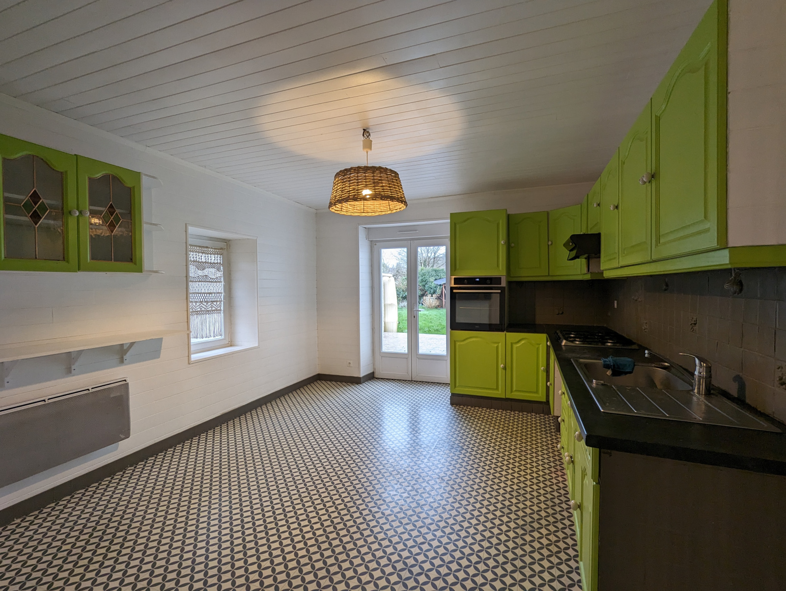 Une très grande cuisine aménagée avec un espace repas, s'ouvre sur une terrasse se prolongeant sur un agréable jardin.