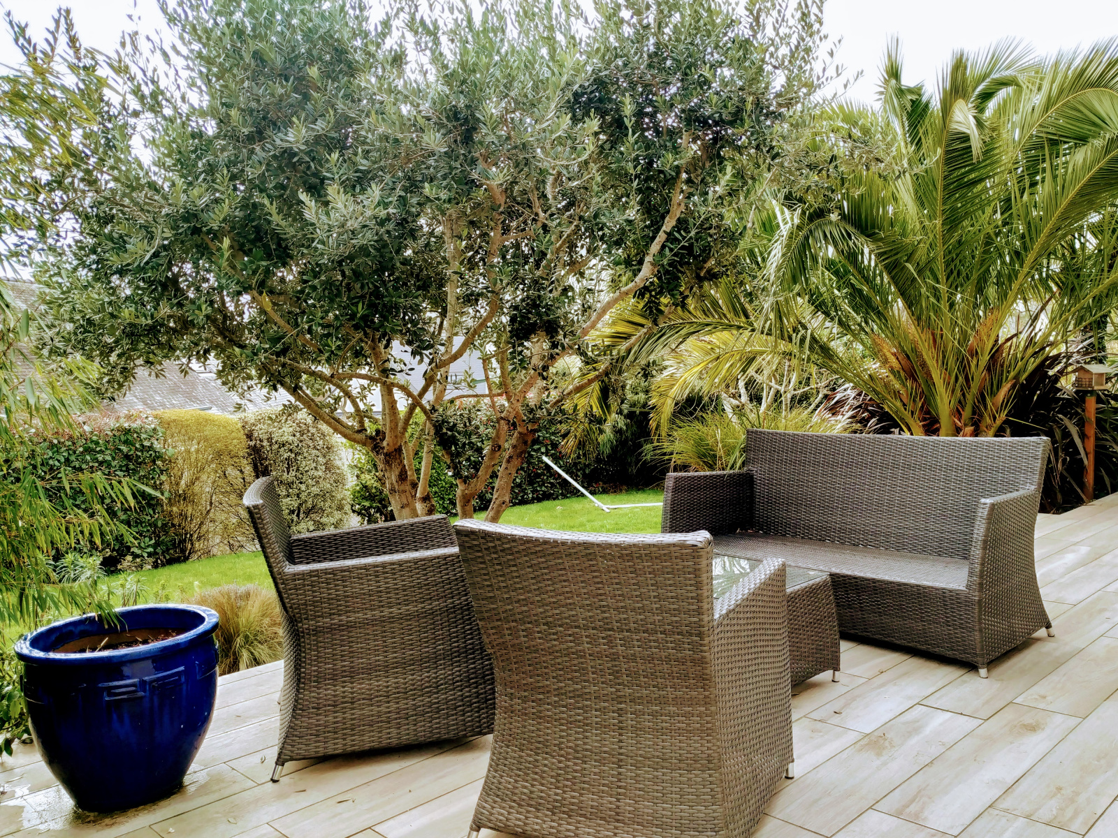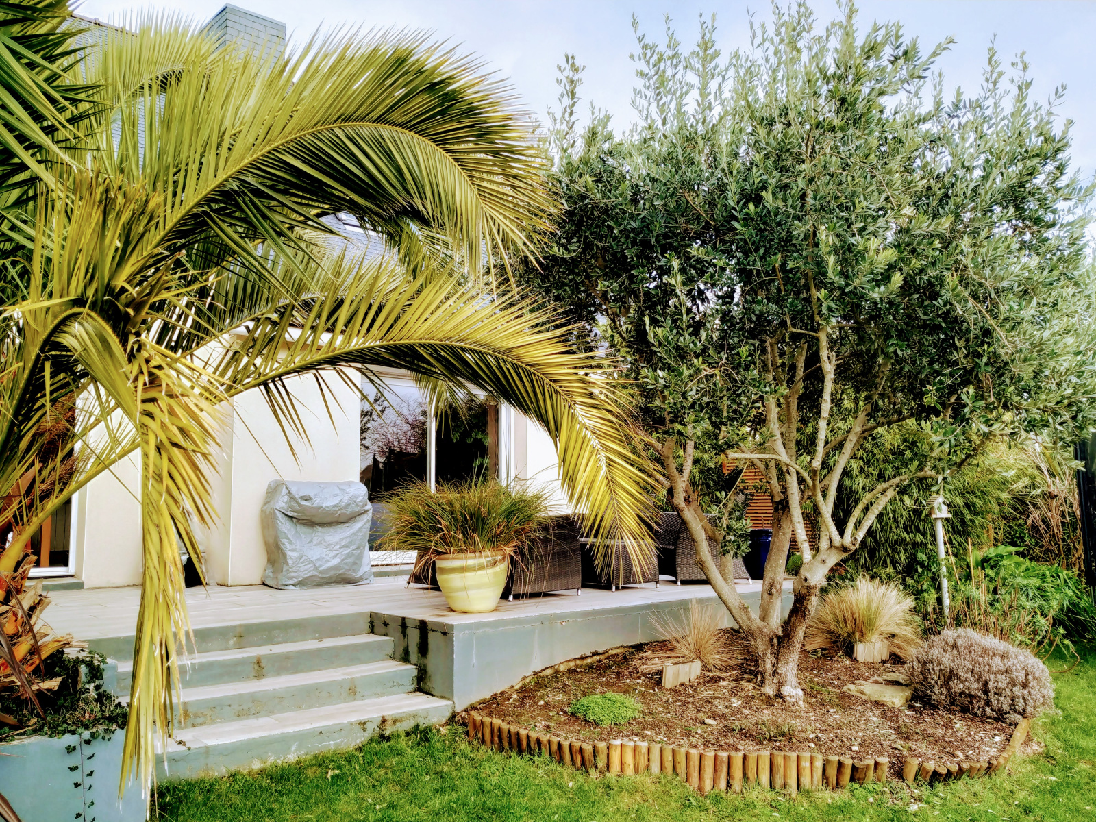 A l'extérieur, vous profiterez d'un jardin paysagé parfaitement entretenu et sans vis à vis dans lequel vous retrouverez différentes essences d'arbres (palmiers, oliviers, érable, saule tortueux..) ainsi qu'un espace potager.